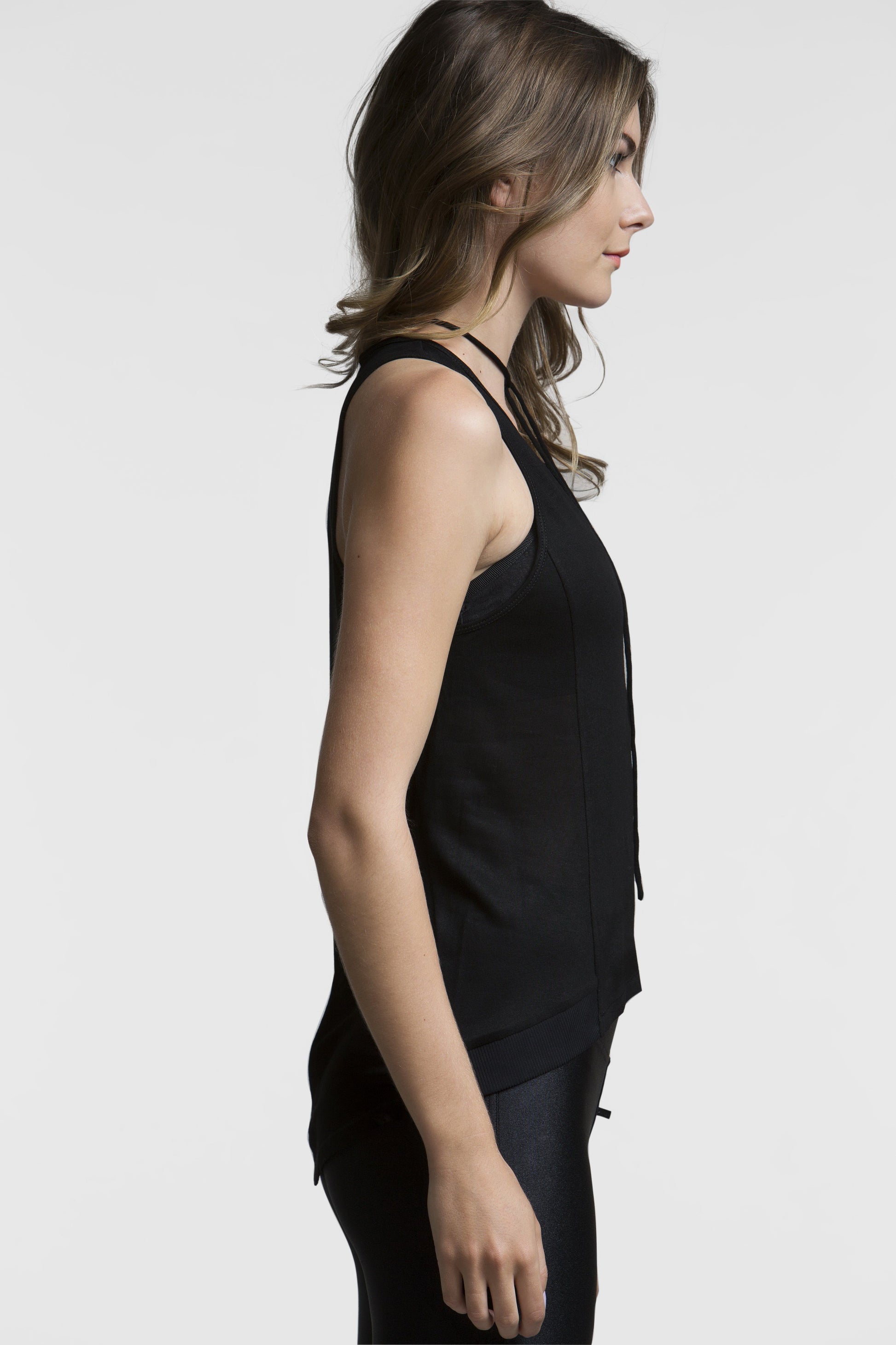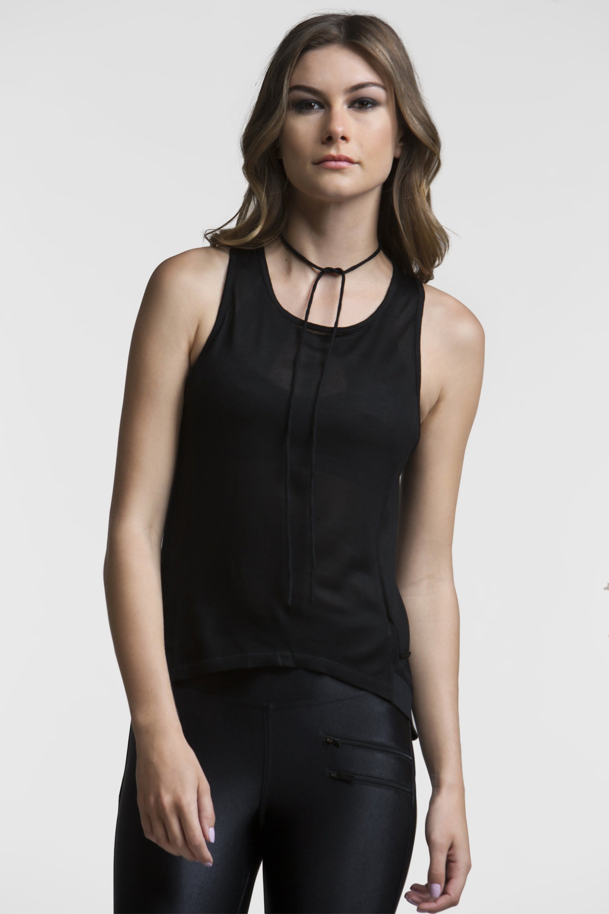 A no-jewelry needed style, tie up this tank's neckline anyway you like. This tank's sheer and light weight fabric makes it a great layering piece, and the perfect top to show off your favourite bra's and bralettes. Super breathable, this breezy tank will keep you feeling cool and comfortable.